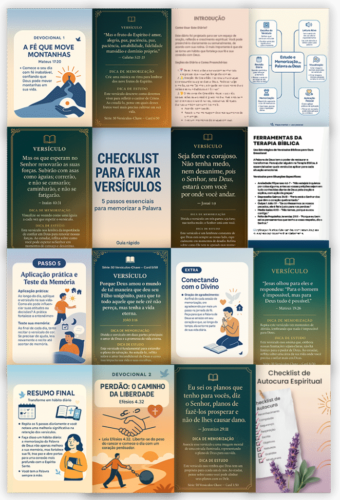 Um guia completo com técnicas de memorização comprovadas, em PDF, instruções detalhadas sobre como usar o planner de aplicação e dicas práticas para transformar sua vida com a Palavra de Deus. Descubra o poder da memorização estratégica e da aplicação diária! Você vai poder imprimir ou acessar pelo celular e aprender em qualquer lugar.